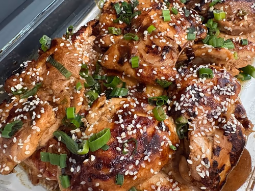 Sesame chicken thighs garnished with green onions in a baking dish.